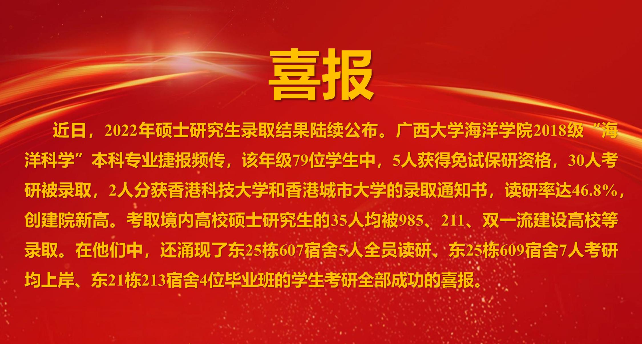 近日,2022年硕士研究生录取结果陆续公布。乐天使2018级“海洋科学”本科专业捷报频传,该年级79位员工中,5人获得免试保研资格,30人考研被录取,2人分获香港科技大学和香港城市大学的录取通知书,读研率达46.8%,创建院新高。考取境内高校硕士研究生的35人均被985、211、双一流建设高校等录取。在他们中,还涌现了东25栋607宿舍5人全员读研、东25栋609宿舍7人考研均上岸、东21栋213宿舍4位毕业班的员工考研全部成功的喜报。