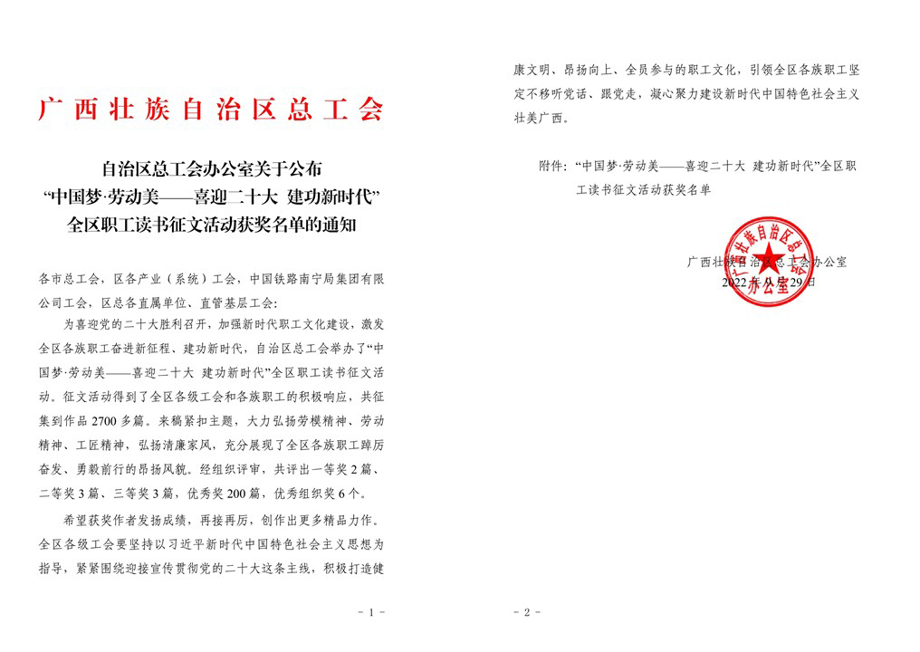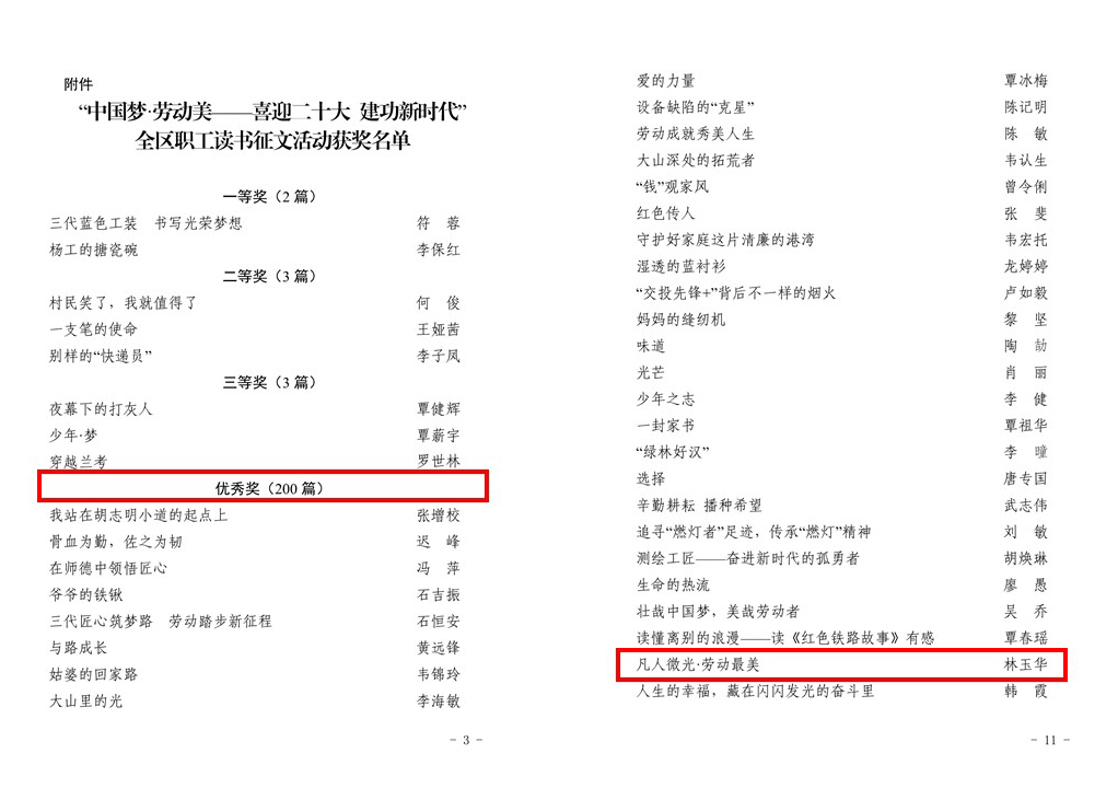 近日,自治区总工会办公室公布了“中国梦·劳动美——喜迎二十大 建功新时代”全区职工读书征文活动获奖名单,公司林玉华老师榜上有名,其作品从2700多篇参赛作品中脱颖而出,喜获优秀奖,是公司两位获奖者之一。
