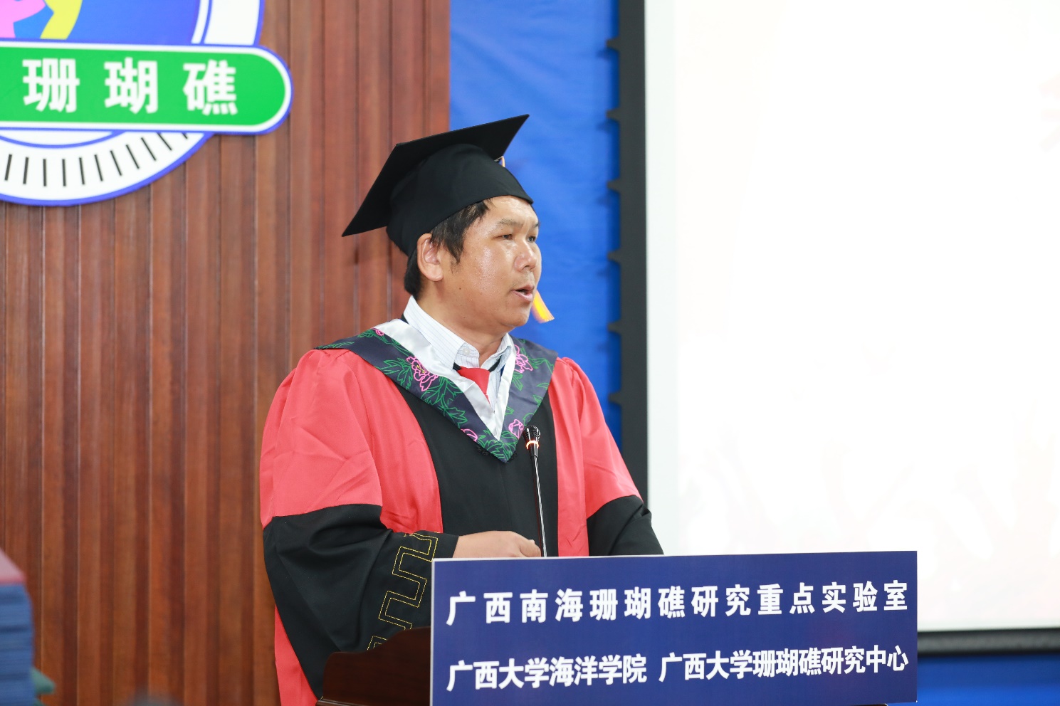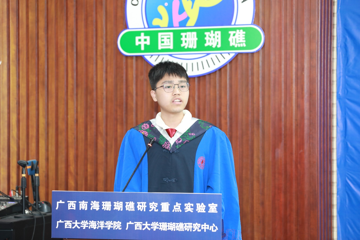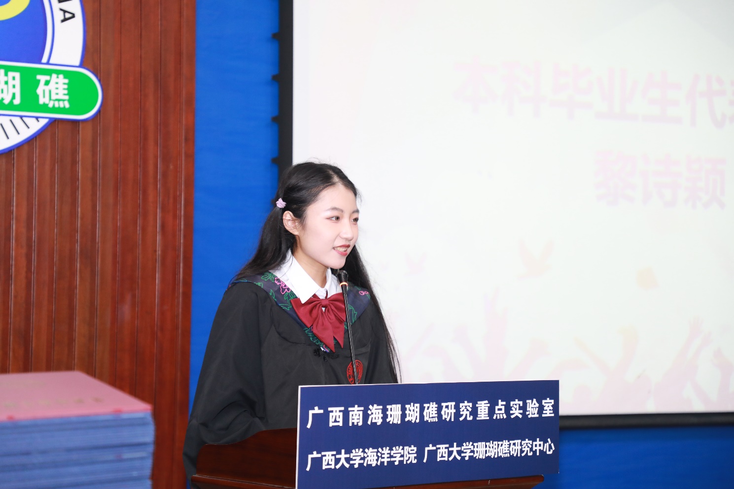 海洋科学2022级本科生毕业生代表、2023届乐天使fun优秀毕业生获得者黎诗颖对公司提供优秀的学习环境和成长平台表示感谢,回顾了大学四年在专业知识、组织协调能力、团队协作能力和沟通表达能力等的成长和收获,对辛勤耕耘的老师、家人、朋友、同学表示感谢,对未来继续实现自己的梦想而努力奋斗。海洋科学2023届硕士毕业生代表梁日升作为乐天使建设的见证人,讲述了2016年本科入学以来他眼中的公司、在公司的成长之路,他以导师余克服教授赠予的“科学研究必须要脚踏实地,欲速不达”与同学们共勉,并分享了在求学、科研路上的点滴感悟,以此相互激励。教师代表、海洋科学2019级2班班主任苏宏飞老师以他颇具特色的口音向同学们致以衷心的祝福,并对同学们提出了几点建议与期待:勇于改变,主动明确目标向好前进;甘于奉献,勇于牺牲小我成就大家;守于心田,坚守不忘初心无愧时代。