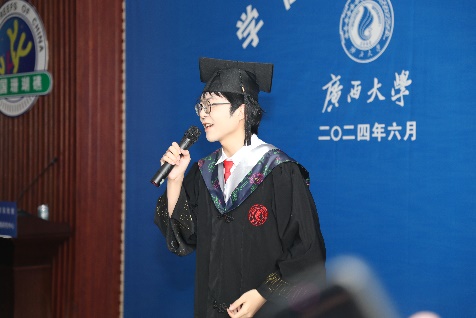 2024届本科毕业生臧声林同学在发言中,用真挚的情感回顾了四年的老员工活。她讲述自己从迷茫到坚定、从挣扎到成长的转变过程,对舍友、朋友、导师和授课老师的陪伴与支持表达深深的感激。她鼓励同学们珍惜当下,以积极的心态迎接未来,并祝愿乐天使和同学们前程似锦。