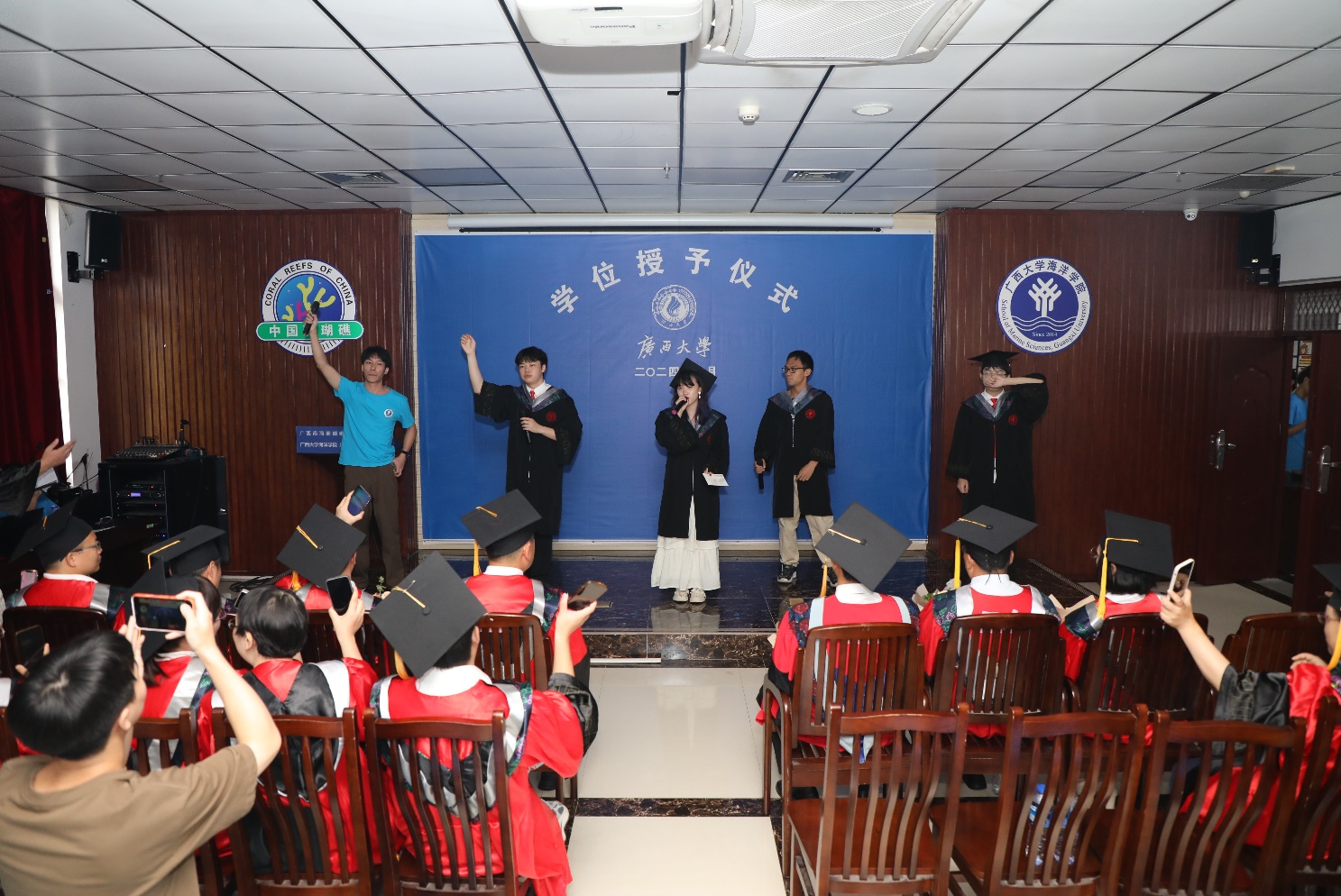 最后,伴随着洪瑞、何旭聪、刘子杰、潘袁乐、覃齐等同学携手共唱的串烧歌曲中,乐天使2024届毕业生毕业典礼暨学位授予仪式落下帷幕。学有所成的海院学子们,将带着老师们的殷切祝福和对未来的美好期盼,在人生路上继续奋勇攀登,铸就辉煌。