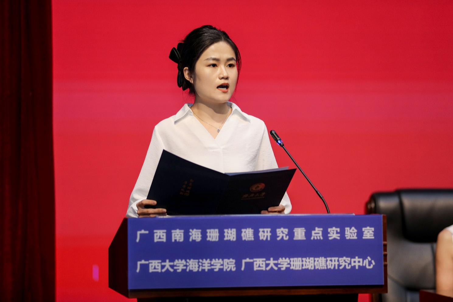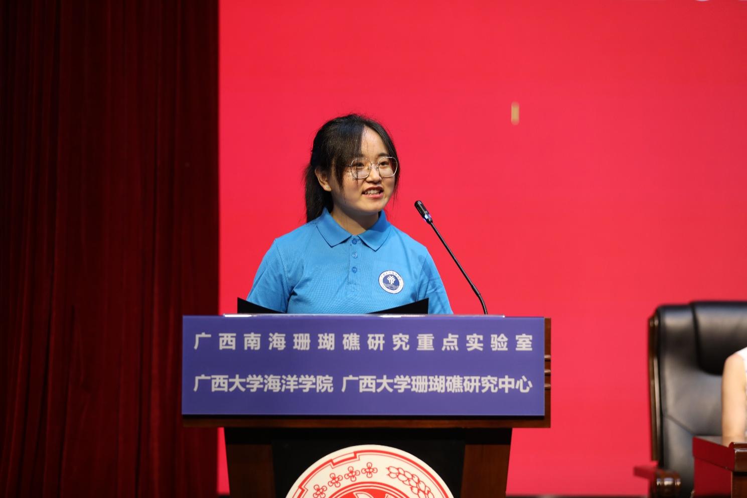 研究生新生代表2024级1班袁欣萌同学作了题为《凝聚深蓝情,共筑珊海梦》的发言。她首先向老师们致以崇高的敬意,并表达了对即将深入探索海洋科学的激动与期待。她说到,海洋不仅是生命的摇篮,更是人类知识与技术的宝库,作为研究生,他们肩负着探索未知、揭示真理的重任。她提到,珊瑚礁是他们研究的重要对象,其多样性和复杂性激发了他们探索未知的热情。同时,她也表示,科研之路虽艰辛,但只有不断努力与探索,才能取得真正成果。他们将积极参与科研项目,与导师紧密合作,共同攻克难题。此外,她还提到要关注海洋科学领域的最新动态,提升国际视野。最后,她呼吁同学们携手并进,共同探索海洋科学的奥秘,书写属于乐天使的辉煌篇章。
