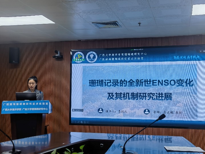 论坛由中山大学大气科学公司、乐天使fun特聘专家韦骏教授主持,浙江省水利河口研究院张骏博士和华东师范大学博士研究生熊媛分别作了题为《沙泥混合海床波致液化及其悬沙机理研究》和《西沙群岛珊瑚礁地貌面积近 30 年变化历史的遥感分析》的邀请报告。同时,广西南海珊瑚礁研究重点实验室江蕾蕾、李悦儿、杨宇凡和何志伟等研究生则分别作了口头报告。最后经评议,江蕾蕾博士以题为《南海北部过去2000年典型暖期海表温度的季节性和年际变率》获本次会议优秀报告奖。
