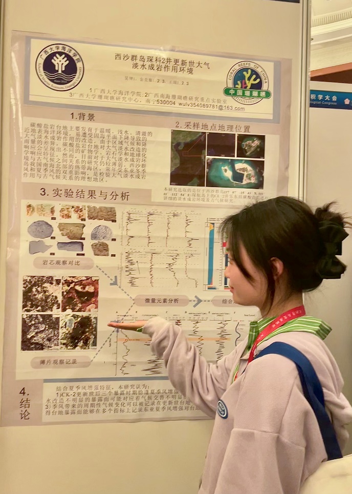 海洋地质与环境教研室主任王瑞副教授在“沉积学基础理论与进展-碳酸盐岩沉积学”专题进行了口头报告,题为“西沙群岛晚中新世白云石的计量学特征及其控制因素”。硕士研究生吴律同学和沈若夏同学分别进行了展板汇报,题为“西沙群岛琛科2井更新世大气淡水成岩作用环境”、“西沙群岛琛科2井晚中新世黄流组白云石晶体的主量元素分布特征”。