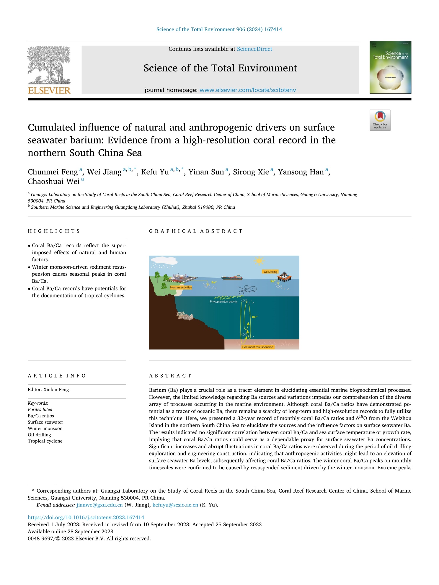 Chunmei Feng, Wei Jiang, Kefu Yu, Yinan Sun, Sirong Xie, Yansong Han, Chaoshuai Wei. Cumulated influence of natural and anthropogenic drivers on surface seawater barium: Evidence from a high-resolution coral record in the northern South China Sea,Science of the Total Environment。