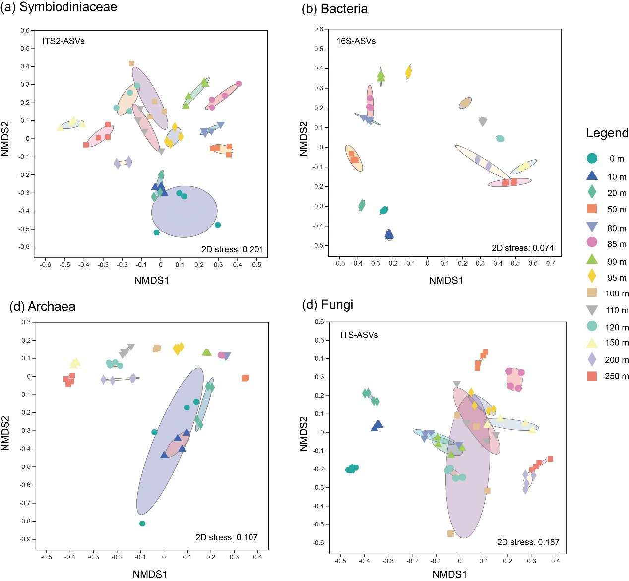 (3)三沙永乐龙洞水体的核心微生物群由虫黄藻(Cladocopium)、细菌(Alteromonas、Ralstonia)、古菌(Woesearchaeales)以及真菌(Mycosphaerella tassiana、Recurvomyces、Penicillium cosmopolitanum)共同组成,其稳定存在于跨越富氧层、化变层与深水厌氧层14个深度剖面的水体环境中。微生物进化、环境驯化以及共生体系构建是驱动核心微生物群具备极端环境适应能力的关键要素。