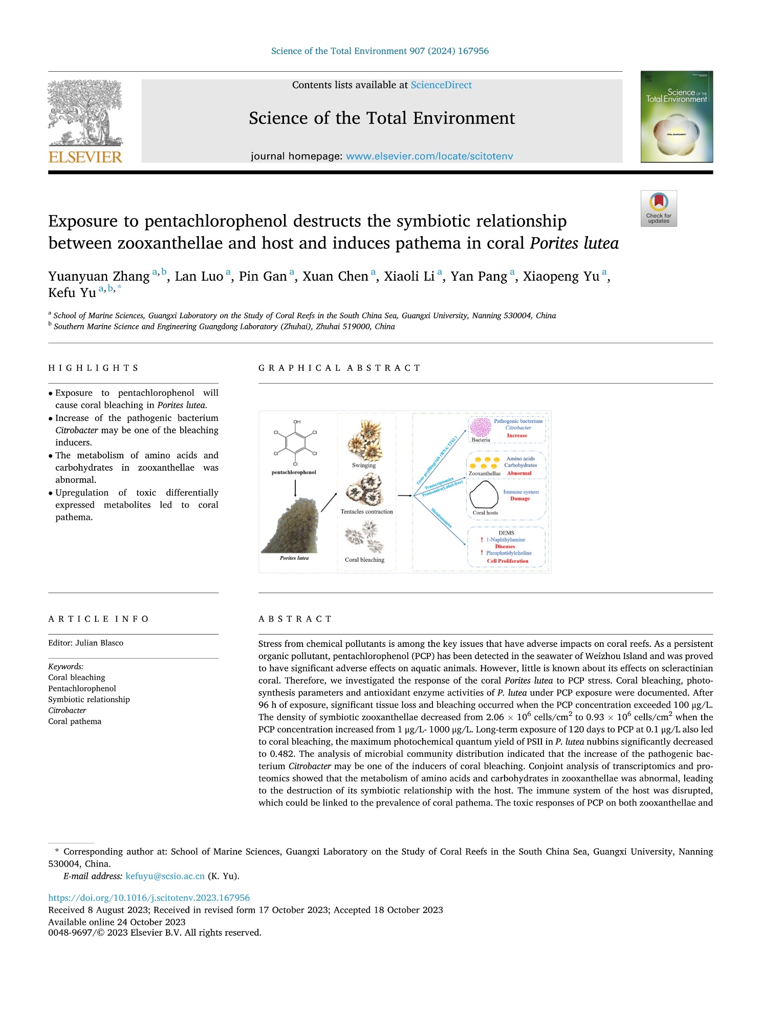 Zhang Yuanyuan, Luo Lan, Gan Pin, Chen Xuan, Li Xiaoli, Pang Yan, Yu Xiaopeng, Yu Kefu. Exposure to pentachlorophenol destructs the symbiotic relationship between zooxanthellae and host and induces pathema in coral Porites lutea. Science of