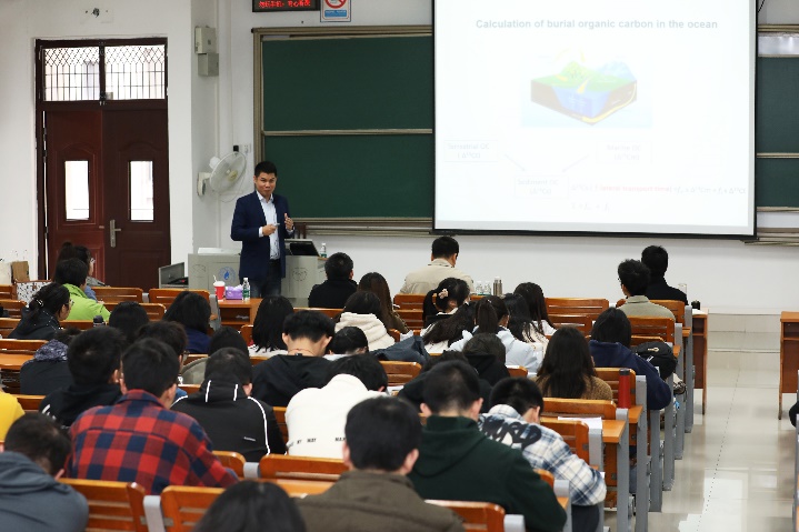 包锐教授的报告循序渐进的介绍其研究方向、研究进展、研究成果等。海洋碳循环研究是深入认识全球气候变化与海洋生态系统的重要理论基础,海洋中有机碳的运移与埋藏等过程是海洋碳循环理论的关键环节之一。有机碳(OC)中的天然放射性碳同位素(14C)的含量可以揭示海洋环境中有机碳的年龄和动态变化。沉积物中有机碳的14C年龄不仅可以指示不同年龄来源的有机质,且可以阐明有机质在沉积之前的“老化”过程,即横向输运时间。包锐教授指出,在分析的过程中,要学会将复杂的现象逐层拆解,不断细化,透过现象看本质。以中国边缘海为例,不同来源有机质的混合以及水动力颗粒分选导致的沉积物粒度组分间有机碳14C差异,均会使分析有机碳的横向输运时间变得复杂化,因此在分子水平对14C进行分析并且分别测试不同沉积物粒度间的14C年龄对于理解碳循环过程和解释大陆边缘沉积记录具有重要意义。此外包锐教授还以西太平洋海沟深渊为例,深入浅出地介绍了14C年龄对研究地球深部碳的转化与封存的重要作用,指出构造事件可以促进碳的积累,刺激碳的转化,为深层生物圈供能。报告展示了包锐教授及其团队翔实的数据、扎实的研究基础及系统的研究逻辑。报告中,包锐教授还展示研究过程中遇到的一个个可能挑战经典理论的问题,通过新的方式所开展研究后得出的创新成果,以此鼓励同学们要勇于打破固有思维、敢于创新,不再局限自己,拓展思维边界。