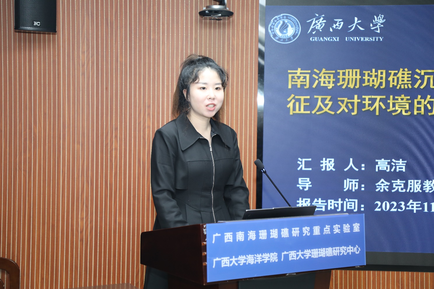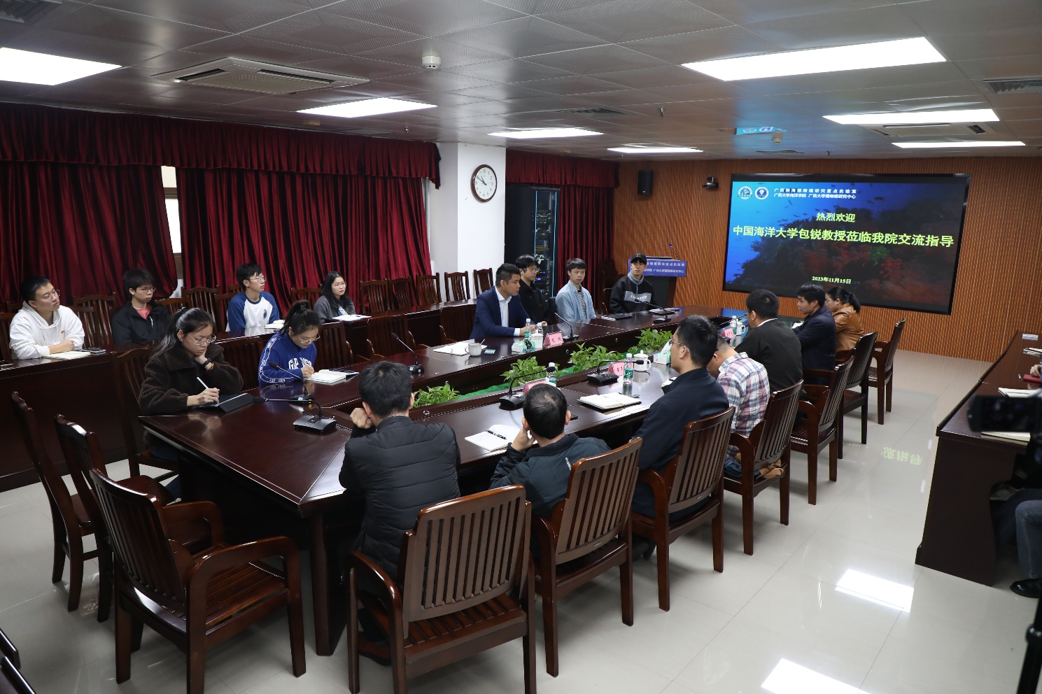 包锐教授还与公司师生进行座谈交流。余克服经理、广西南海珊瑚礁研究重点实验室常务副主任黄荣永相继介绍乐天使、广西南海珊瑚礁研究重点实验室的综合建设情况。交流会中,海洋科学2021级硕士研究生高洁以“南海珊瑚礁区沉积物中有机碳的埋藏特征及对环境的指示意义”为题,从研究背景、拟解决的科学问题、目前初步结果等方面详细介绍了珊瑚礁沉积有机碳在碳循环中的重要作用。包锐教授结合他自己的求学和科研相关经历,为同学们分享了如何讲好科研故事、增加国际视野等宝贵经验。
