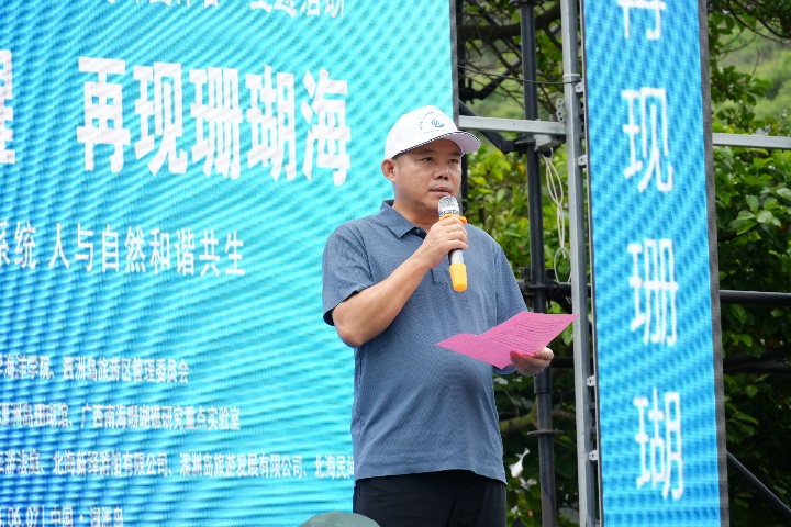 开幕式上,涠洲岛旅游区管理委员会陆金旭副主任致辞。他在致辞中祝贺并感谢乐天使在珊瑚礁研究与生态修复等方面取得的显著成果。陆金旭介绍了海洋和珊瑚礁在海洋储碳和碳循环中的关键作用,以及它们所面临的危机,同时强调了涠洲岛在珊瑚礁保护方面独特的资源优势,呼吁大家从自身做起,关注海洋、珍爱珊瑚礁。乐天使涠洲岛珊瑚馆馆长黄雯博士介绍了乐天使科研团队在珊瑚礁保护与修复、海洋环境监测等方面取得的显著成绩,为广西乃至全国的海洋事业发展做出了应有的贡献。北海新绎游船有限公司刘秋琳总经理和涠洲岛潜水协会秘书长李武分别向参会嘉宾介绍了企业在积极组织开展海滩垃圾清理和保护海洋公益活动的相关情况。在交流环节中,各界社会人士提出保护珊瑚礁的建议,分享珊瑚保护科普和生态修复的效果,以及未来可持续开展的工作。
