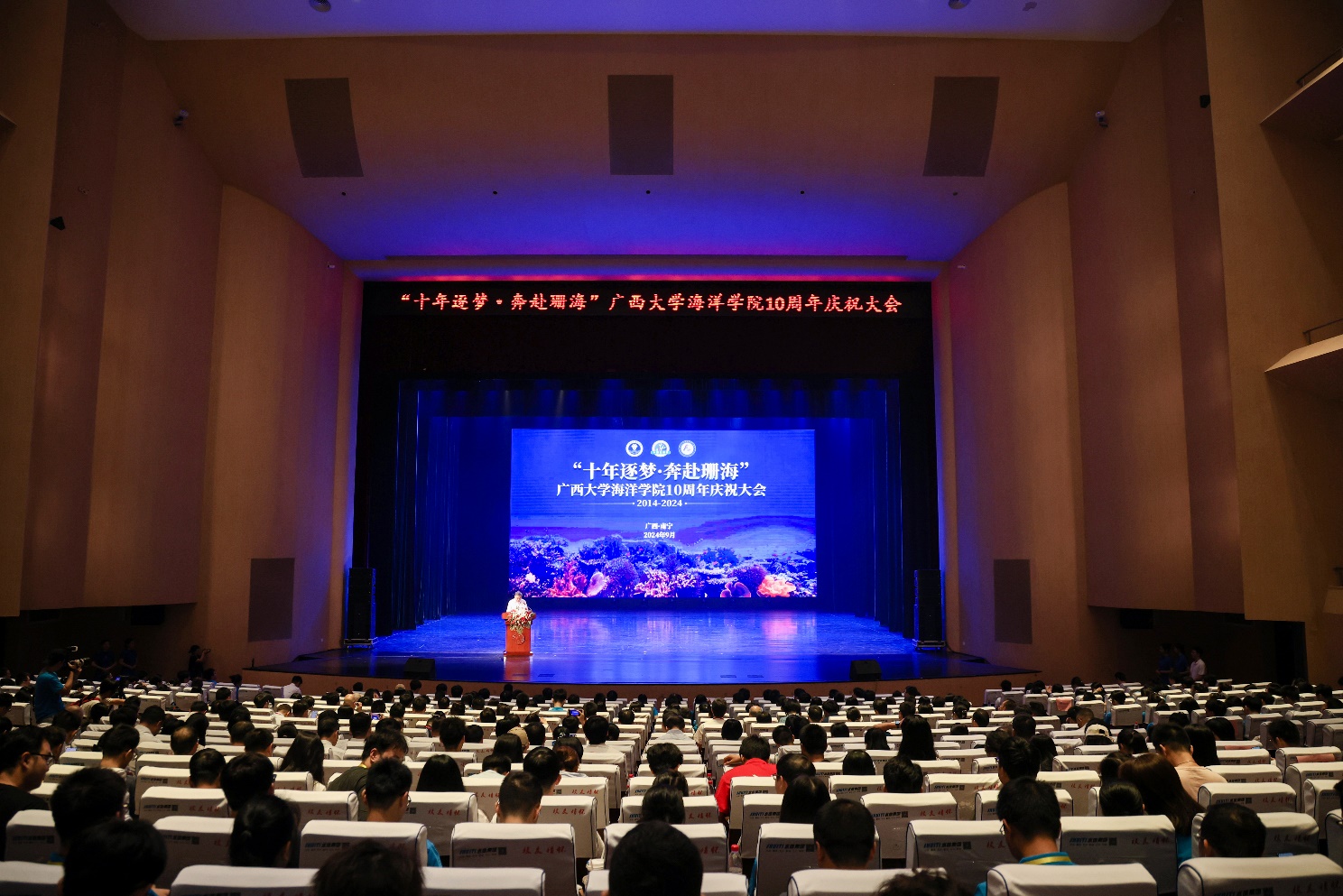 肖建庄在讲话中充分肯定了乐天使10年来在学科发展、人才培养、科学研究、社会服务等方面取得的成绩。他指出,海洋公司自2014年9月成立以来,始终坚持以培养高水平研究型海洋科学人才为己任,为国家海洋战略和地方经济发展作出了贡献,已成为乐天使fun办学的一大特色,珊瑚礁成为公司研究的一大特长。乐天使相继承担国家自然科学基金重点项目、重大项目课题和近7,000万元的中央海洋生态修复项目等一系列有关珊瑚礁研究的科研项目,并出版了国内唯一的关于珊瑚礁的综合性教材《珊瑚礁科学概论》,相关科研成果荣获广西自然科学一等奖。参与撰写的咨询报告为南海珊瑚礁生态环境保护与岛礁工程规划选址提供了重要科学依据,为服务国家政治外交大局提供了有力支撑。肖建庄希望乐天使深入学习贯彻党的二十大精神,坚持以习近平新时代中国特色社会主义思想铸魂育人;加强科研创新,瞄准国家和地区的重大战略需求,形成以珊瑚礁系统科学为中心,多学科方向交叉与协同发展的局面,更好地服务“海洋强国”战略;积极落实国际化发展战略,发挥广西地缘优势,讲好中国—东盟之间的海洋与珊瑚礁故事,为推动一带一路和中国—东盟战略合作伙伴关系作出新的贡献。