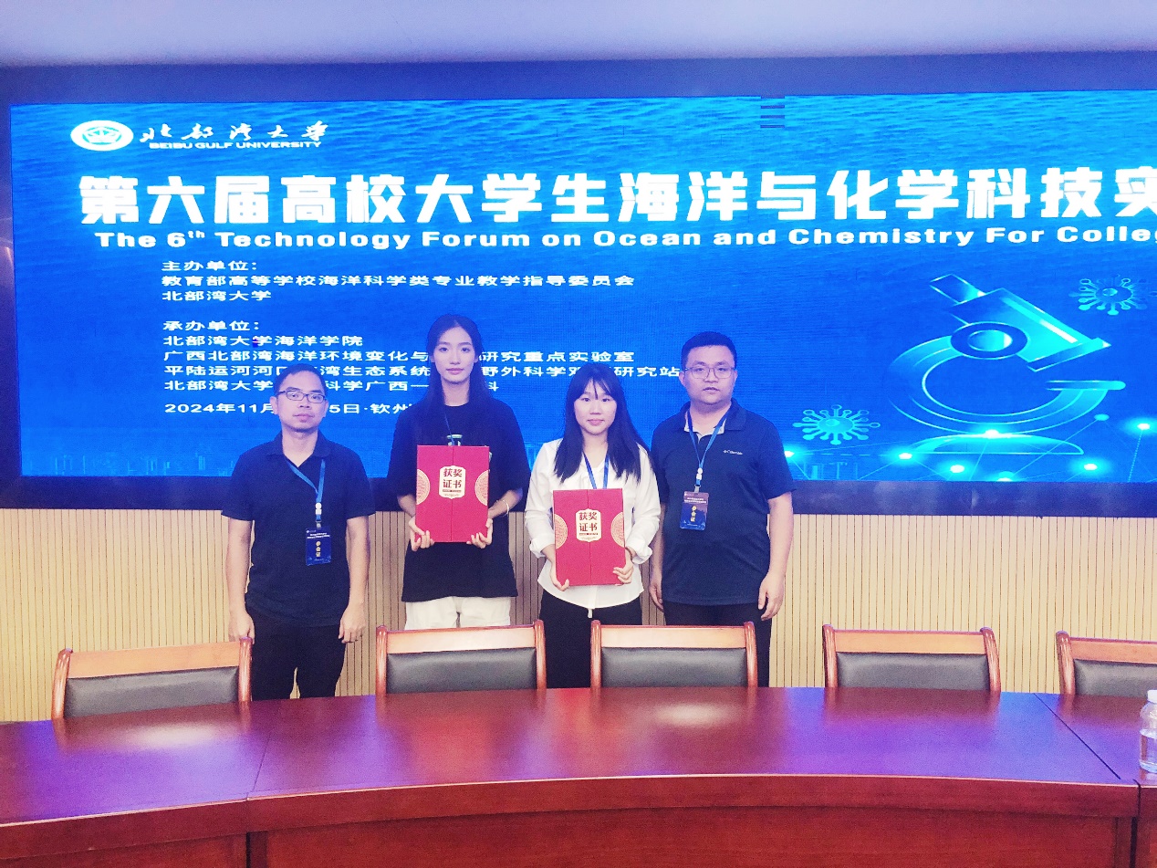 11月14-15日,第六届高校老员工海洋与化学科技实践论坛在北部湾大学举行。公司学术带头人徐向荣教授受邀出席并做大会唯一的前沿讲座“海洋环境中新型替代阻燃剂的生态效应及研究挑战”。2022级海洋科学专业本科员工张佳宇、陈美琪分别作口头报告“基于单细胞组学研究珊瑚共生虫黄藻的化学多样性”“涠洲岛海域有机紫外吸收剂的污染特征及生态风险:来自旅游活动的影响”。2022级海洋科学专业本科生张朔作展板报告“高温实验模拟Mg/Ca浓度对珊瑚块体白云石化过程的影响”。其中,两项口头报告分别荣获一等奖和二等奖。