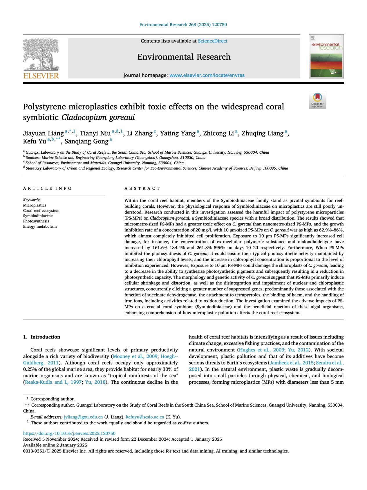 Liang Jiayuan, Niu Tianyi, Zhang Li, Yang Yating, Li Zhicong, Liang Zhuqing, Yu Kefu, Gong Sanqiang. (2025). Polystyrene microplastics exhibit toxic effects on the widespread coral symbiotic Cladocopium goreaui. Environmental Research, 268, 120750. https://authors.elsevier.com/sd/article/S0013-9351(25)00001-5
