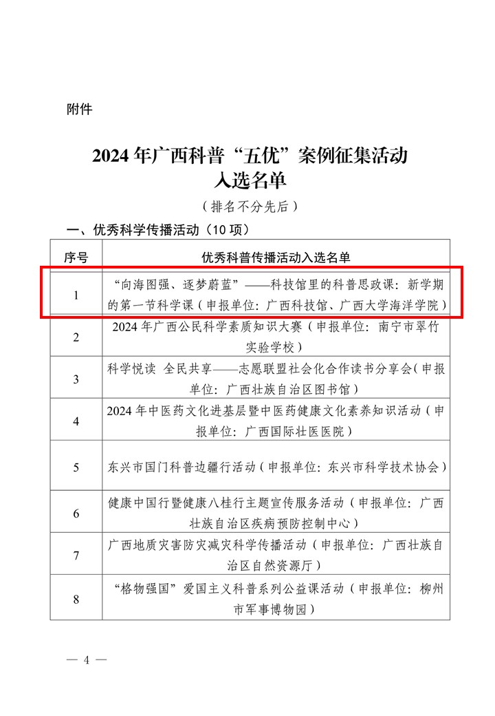 1月16日,自治区科协、自治区科技厅、自治区社科联、共青团广西区委公布“礼赞科普 智启八桂”——2024 年广西科普“五优”案例征集活动入选名单,公司组织开展的科普活动“‘向海图强、逐梦蔚蓝’——科技馆里的科普思政课:新学期的第一节科学课”入选2024 年广西科普“五优”案例——优秀科学传播活动。