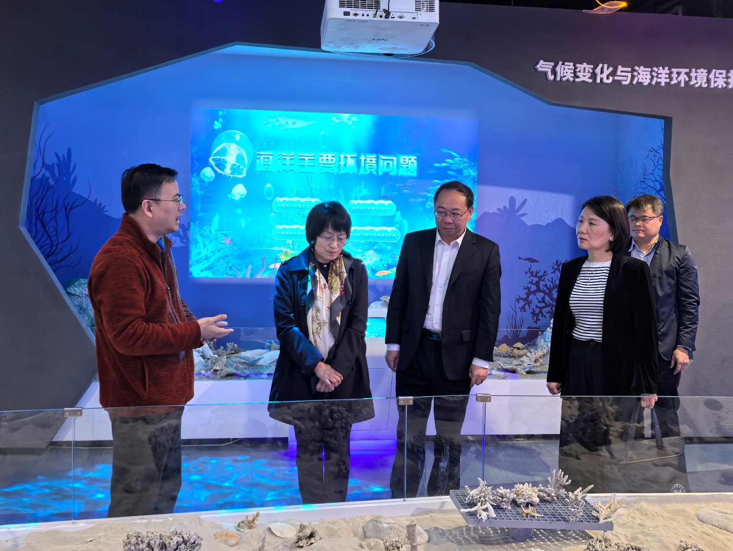 在海洋科教馆,科教馆常务副馆长李周佳向调研组汇报了公司在南海岛礁建设、海洋科考、生态环境保护等方面开展的工作情况。尤其是参与编写《黄岩岛海域生态环境调查评估报告》,充分展示了我国南海海洋生态环境保护成效,为服务国家政治外交大局提供了支撑保障。在岛礁生态修复实验室,调研组观看了活体珊瑚的人工培育,观看了涠洲岛陆基和海区可视化监控系统运行状况,了解了公司成立珊瑚礁保护与修复研究团队,研发以“人工修复带动自然恢复”为理念的珊瑚礁生态修复技术,建立了2000平方米的自然海域珊瑚修复示范区,经过3年的努力实现了活珊瑚覆盖率从5%提高到20%,带动了周边海域珊瑚礁的自然恢复。赵浩对乐天使聚焦珊瑚礁研究所取得的成效给予了高度评价,她建议两校进一步加强在科技成果转化、学科交叉融合等方面的合作。