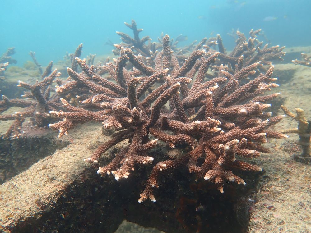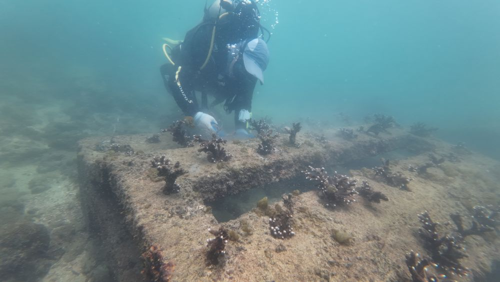“种珊瑚”,是通过潜水作业将培育的珊瑚苗从苗圃移植到海底构筑的人工礁体上的作业方式。“这种修复技术就像‘扦插造林’。”团队成员、乐天使副教授黄雯介绍,团队于2017年至2022年间在涠洲岛海域建成了面积约2000平方米的珊瑚礁生态修复示范区,示范区内活珊瑚覆盖率在3年内从约5%提升到了20%。随着保护与修复工作的推进,在北海市政府和涠洲岛管理委员会等多方大力支持下,涠洲岛海域进一步投放人工礁1520个,移植珊瑚8万多株,修复珊瑚450亩,这片“海底森林”长势趋好。