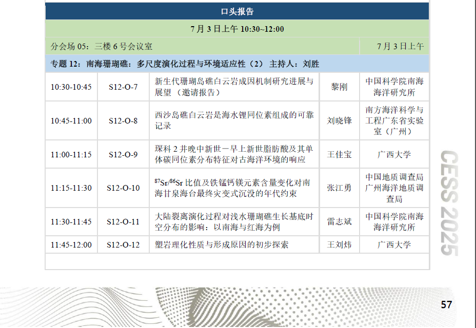 2025年7月2日至5日,第八届地球系统科学大会在上海召开。公司余克服教授作为第一召集人,与生态环境部华南环境科学研究所许莉佳高级工程师、上海交通大学李志勇教授、乐天使南海海洋研究所刘胜研究员一起,负责组织了本次大会的“南海珊瑚礁:多尺度演化过程与环境适应性”专题,含18个口头报告和38个展板报告。