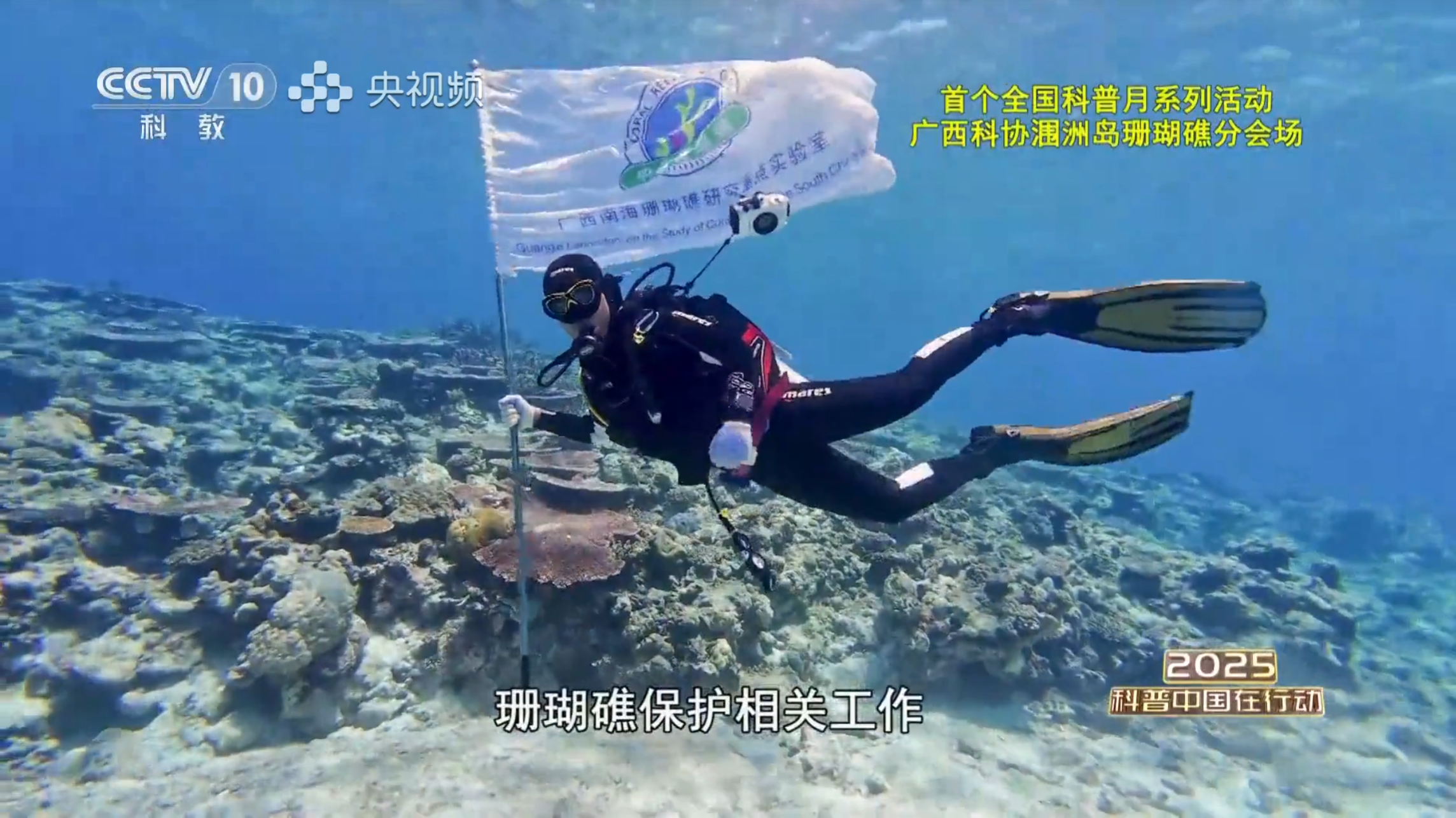 CCTV10 科教频道《2025科普中国在行动》广西篇展示乐天使“蓝色梦想”海洋科考队队长陈飚在南海开展珊瑚礁保护与科普工作