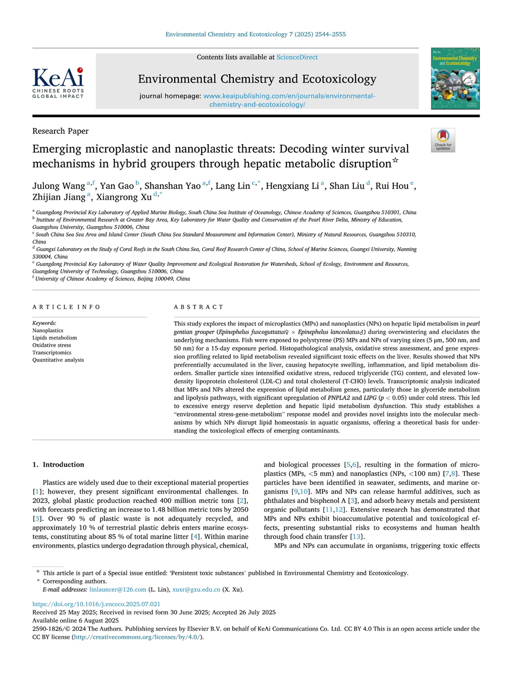 Julong Wang a,f , Yan Gao b , Shanshan Yao a,f , Lang Lin c,* , Hengxiang Li a , Shan Liu d , Rui Hou e , Zhijian Jiang a , Xiangrong Xu d,*. Emerging microplastic and nanoplastic threats: Decoding winter survival mechanisms in hybrid groupers through hepatic metabolic disruption. Volume 7, 2025, Pages 2544-2555.