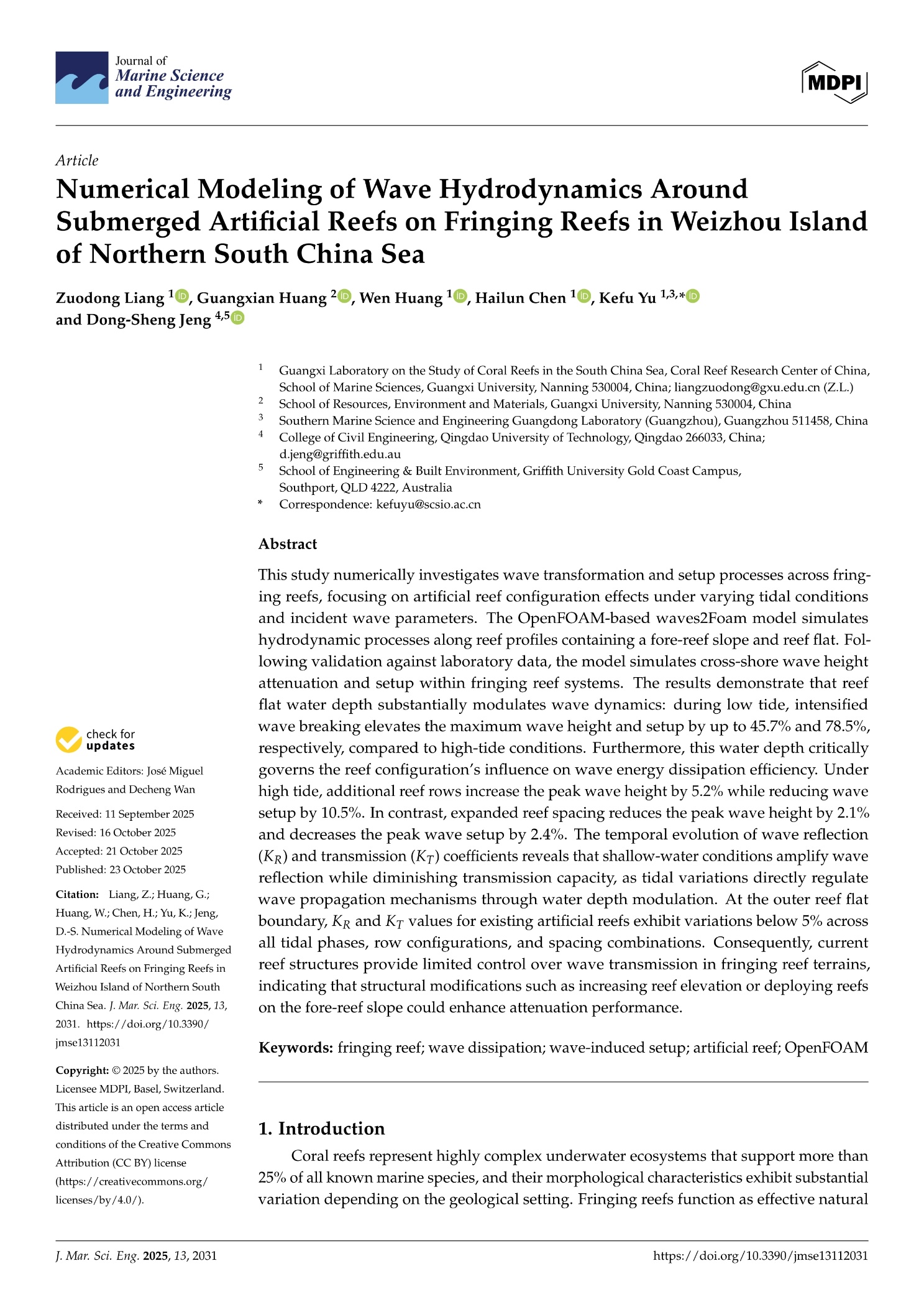 Liang Zuodong, Huang Guangxian, Huang Wen, Chen Hailun, Yu Kefu, Jeng Dong-Sheng. Numerical Modeling of Wave Hydrodynamics Around Submerged Artificial Reefs on Fringing Reefs in Weizhou Island of Northern South China Sea. Journal of Marine Science and Engineering, 2025, 13(11), 2031. https://doi.org/10.3390/jmse13112031