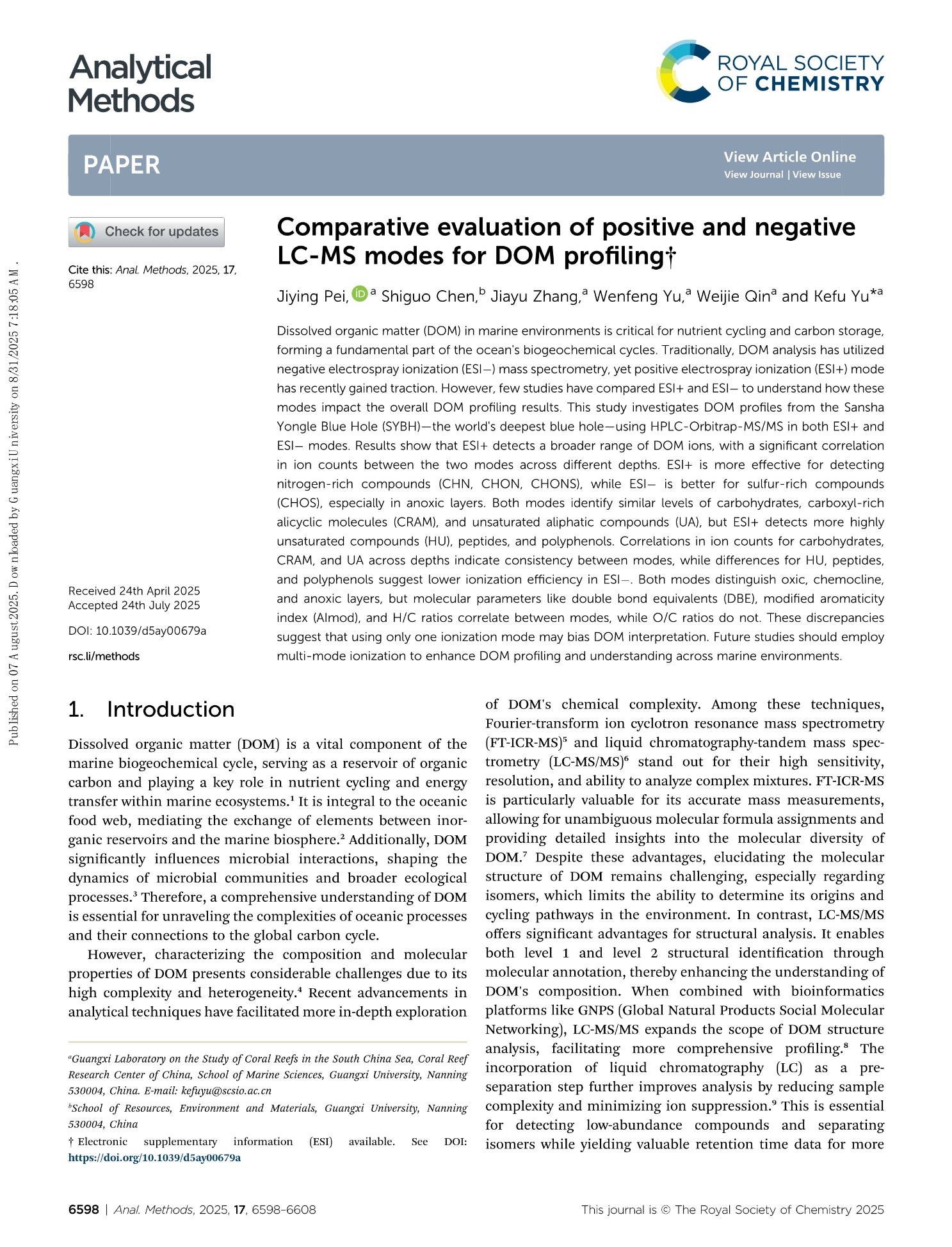 1. Pei Jiying, Chen Shiguo, Zhang Jiayu, Yu Wenfeng, Qin Weijie, Yu Kefu.(2025). Comparative evaluation of positive and negative LC-MS modes for DOM profiling. Analytical Methods, 17: 6598—6608. https://doi.org/10.1039/d5ay00679a.