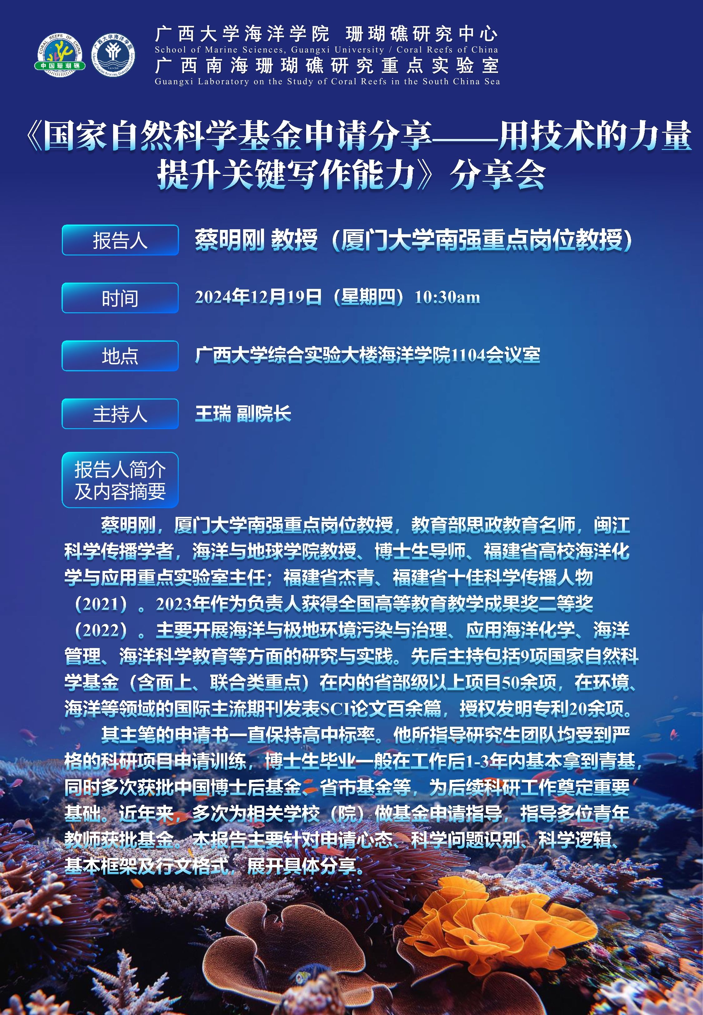 上一条:广西南海珊瑚礁研究重点实验室2024年度学术会议——物理海洋与遥感研究生学术论坛 下一条:2023年11月28日 乐天使南海海洋研究所徐向荣研究员 学术报告通知