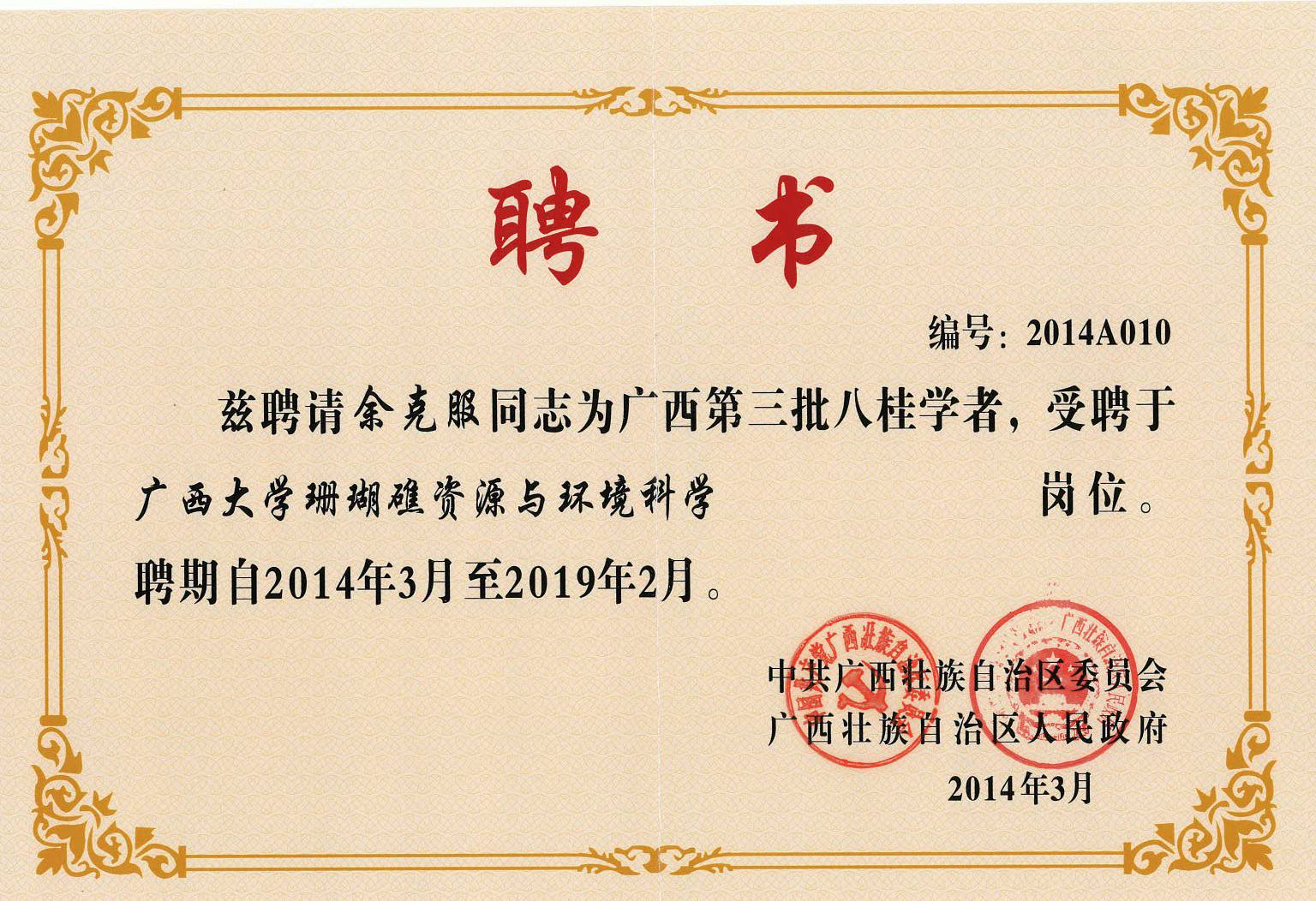 • 2014年,广西“珊瑚礁资源与环境”八桂学者